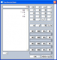 Das IFW enthält einen einfachen RechnerRechner für Grundrechenarten. für Grundrechenarten, Kreisfunktionen (sin(), cos(), tan()), Wurzel und Prozentfunktion. Er kann im IFW auf vielen Zahlenfeldern mit der Tastenkombination