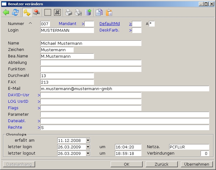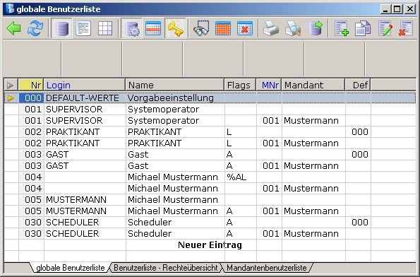 Für jeden Benutzer wird automatisch ein neuer Eintrag in der Benutzerliste erzeugt. Er erhält dabei die gleichen Rechte und Paßwort wie im Standardmandant.
