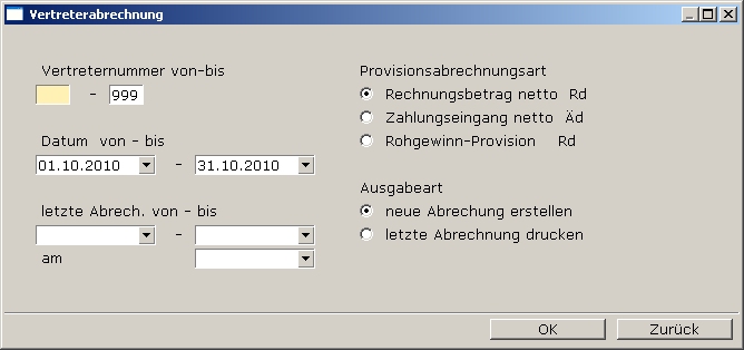 Die Vertreterabrechnung wird über den Menüpunkt Vertrieb | Offene Posten Verwaltung | Vertreterabrechnung aufgerufen. Es öffnet sich folgende Maske: