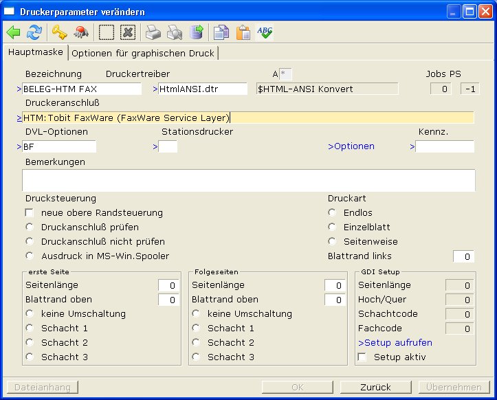 Druckeranschluß: Drücken Sie F1 und wählen Sie WIN:Tobit FaxWare (FaxWare Service Layer). Ändern Sie den Eintrag auf HTM:Tobit FaxWare (FaxWare Service Layer). Sollten Sie Tobit David nicht einsetzen wählen Sie ihren Faxdrucker.