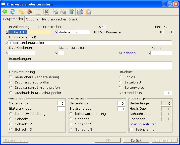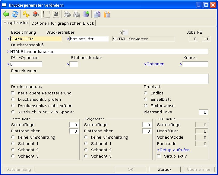 Druckeranschluß: Drücken Sie F1 und wählen Sie einen Drucker mit dem Vorsatz WIN: aus der Liste aus. Ändern Sie dann den Vorsatz auf HTM:. Lesen Sie auch den Abschnitt Druckeranschluß.