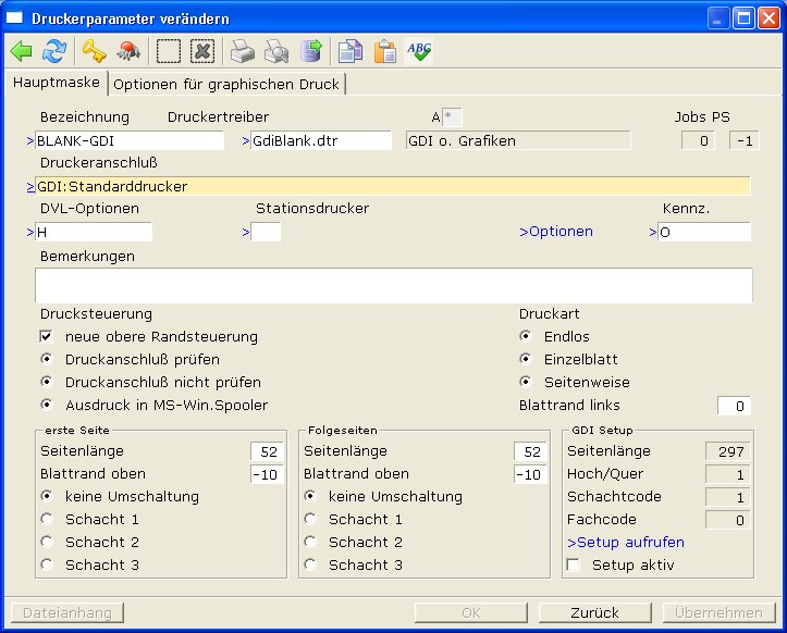 Druckeranschluß: Drücken Sie F1 und wählen Sie einen Drucker mit dem Vorsatz GDI: aus der Liste aus. Lesen Sie auch den Abschnitt
