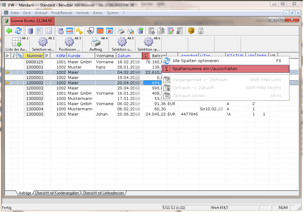 Öffnen Sie eine Auswahlliste, z.B. über den Menüpunkt "Vertrieb| Aufträge| Aufträge anschauen/ausdrucken".