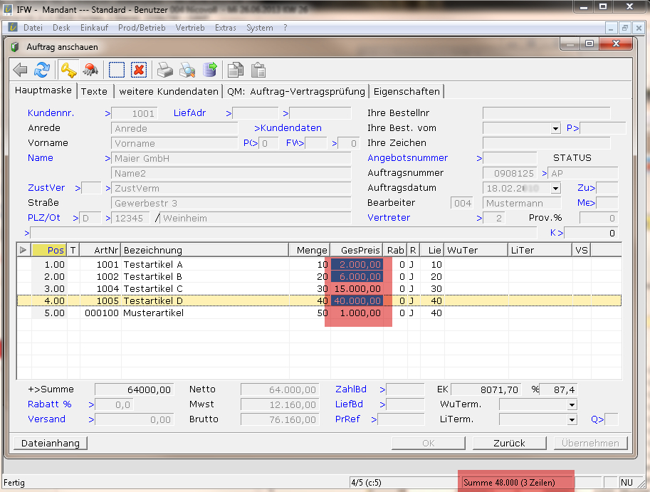 gekennzeichnet und in der Fensterüberschrift (links oben) erscheint: "Summe Brutto xxxx,xx".