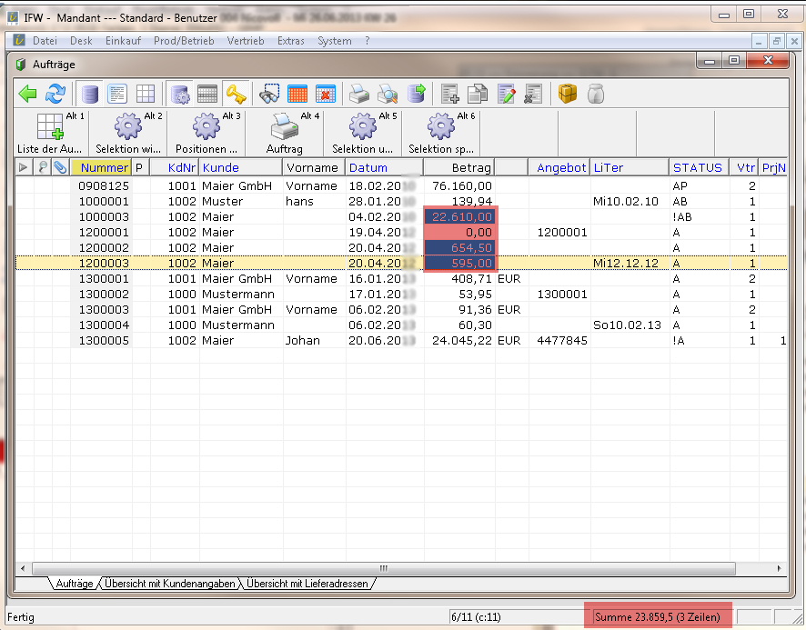 Öffnen Sie eine AuswahllisteÜbersichtsliste im IFW, z.B. über den Menüpunkt "Vertrieb| Aufträge| Aufträge anschauen/ausdruckenDatenausgabe auf Papier oder in eine Datei".