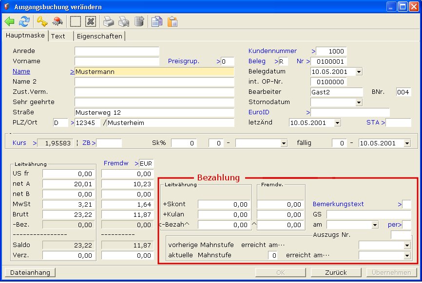 Der Betrag auf dem Kontoauszug (bzw. die Summe der bislang bezahlten Teilbeträge) muß immer exakt mit dem Betrag im Feld Bezah^ übereinstimmen.