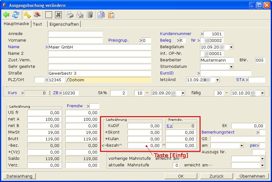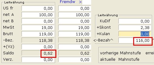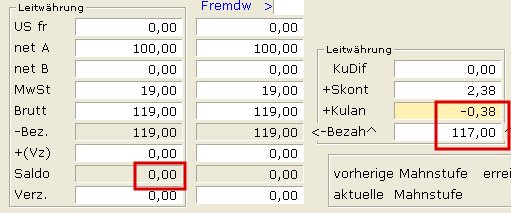 Bezahlt der Kunde mehr, z.B. wegen kleinen Abweichungen bei Währungsumrechnungen, kann die Differenz ebenfalls mit dem Feld Kulanz ausgeglichen werden. Wird z.B. 117,00 statt 116,38 bezahlt, ändern Sie im Feld Bezah^ den Wert auf 117,00 und verlassen Sie das Feld (z.B. mit ↑). Das IFW zeigt weiterhin den berechtigten Skontoabzug an, allerdings weist das Feld Saldo durch die Überzahlung einen Restbetrag von -,38 aus: