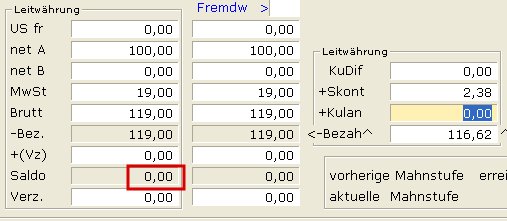 Wenn Sie die Überzahlung akzeptieren tragen Sie im Feld Kulan: den Saldobetrag ein und verlassen Sie das Feld (mit ↑) um die Berechnung auszulösen. Dadurch wird der Saldo zu 0,00 und die Forderung ist vollständig bezahlt.