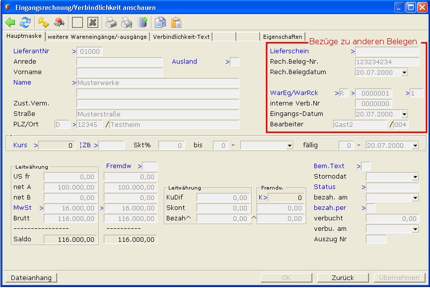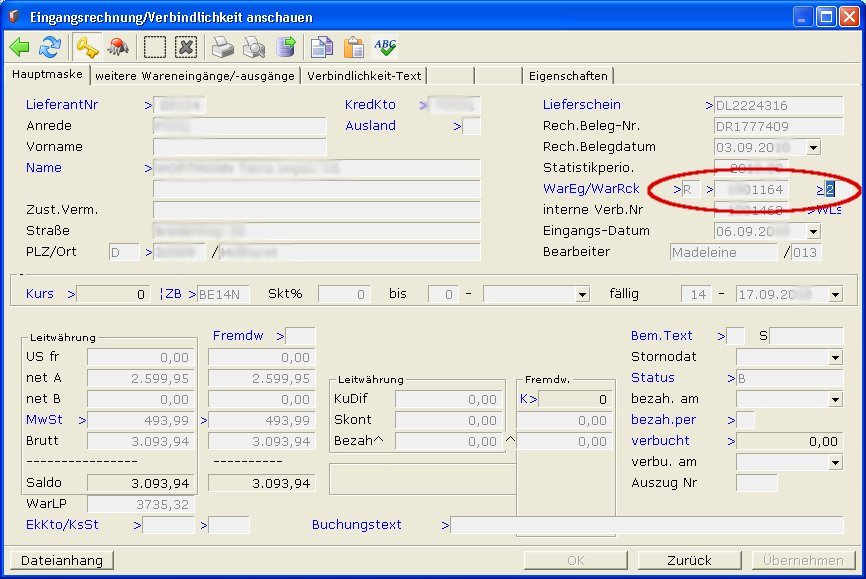 Speicherndauerhaftes Festschreiben ihrer Eingaben in der Datenbank Sie den Beleg ab (z. F2). Beim Abspeichern wird der zugehörende Wareneingang (Feld WarEg/ WarRck der Verbindlichkeit) abgeschlossen. D.h. das Kennzeichen E im Feld Vermerk der Wareneingangsmaske wird gesetzt.