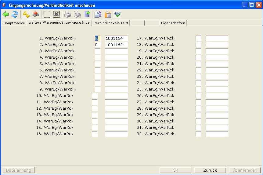 Es können bis zu 32 Wareneingänge auf einer Verbindlichkeit erfasst werden.