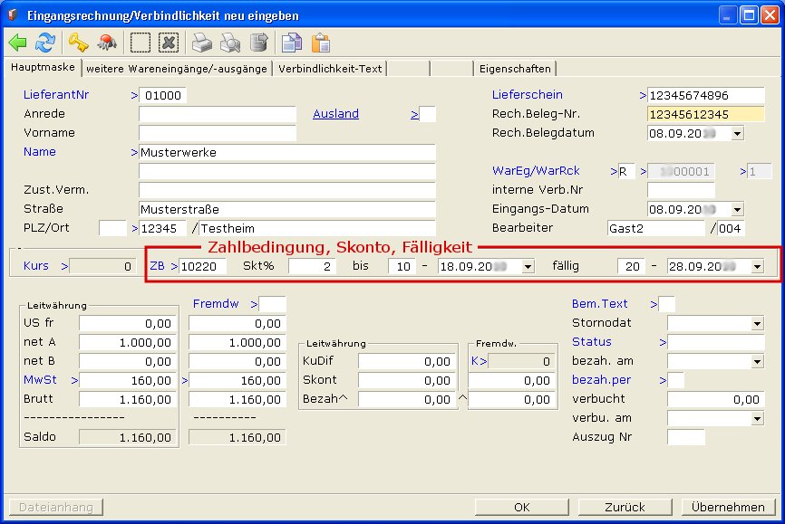 - ZB> Prüfen Sie die Zahlungsbedingungen. Das Skonto wird anhand der Zahlungsbedingung und dem Datum aus dem Feld RechBelegdatum errechnet. Die Zahlungsbedingung wird aus dem Feld Zahl.Bed> des Wareneingangs übernommen.