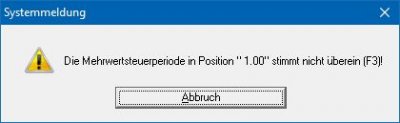 Diese Meldung erhalten Sie wenn das Kennzeichen im Feld PG nicht zu der in der Position vermerkten Mehrwersteuer passt. Prüfen Sie Ihre Einstellungen. Drücken Sie auf der ersten Position die Tase F3, damit das IFW die Einstellungen korrigieren kann.