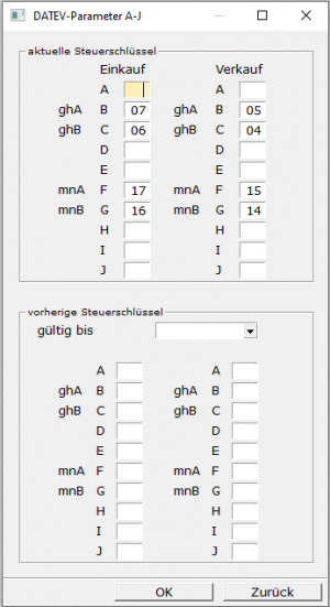 Zur Maske Datev-Parameter wurde eine weitere Maske DATEV-Parameter A-J hinzugefügt. Darin werden weitere Steuerschlüssel für die verschiedenen Zeiträume definiert. Die Steuerschlüssel benötigt Datev bei der Übergabe von Nicht-Automatikkonten.