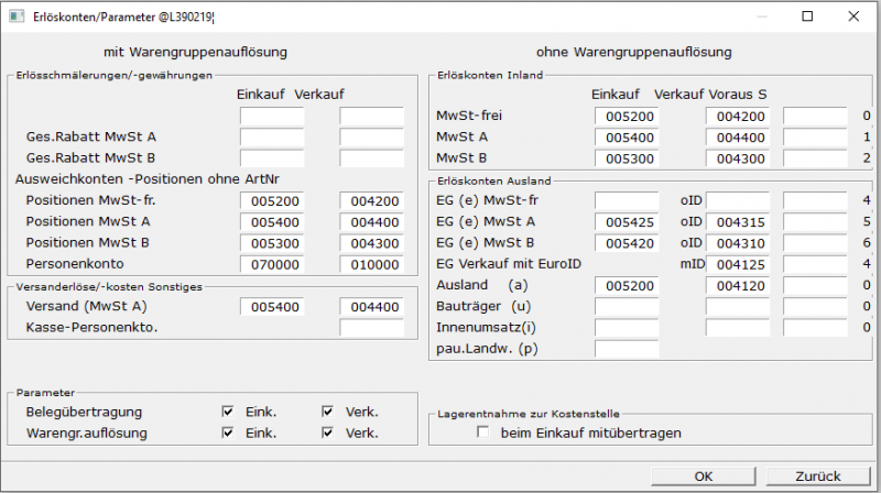 Maske Erlöskonten/Parameter