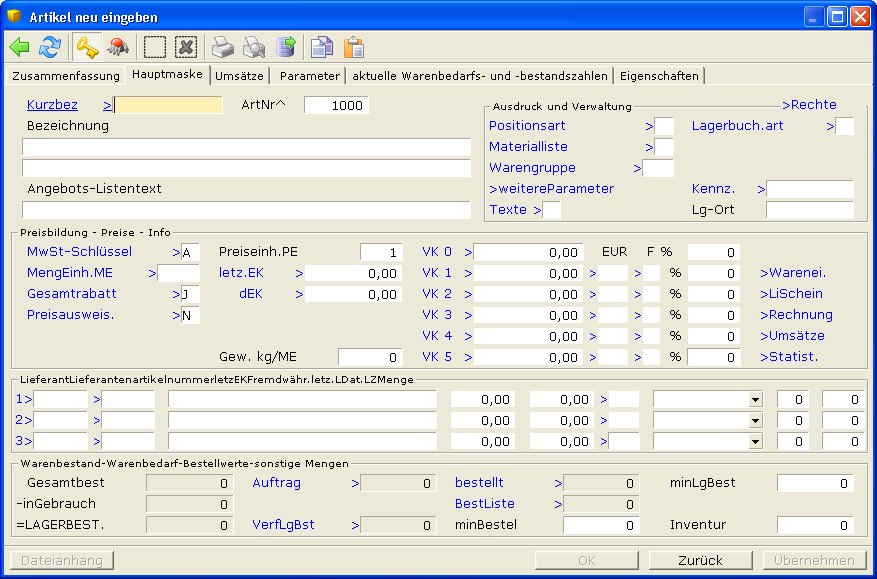 Die Artikelmaske enthält sehr viele Informationsfelder, durch die später Herkunft, Verbleib und Statistiken der Artikel erfragt werden können. An dieser Stelle werden nur die wichtigsten Felder für die Anlage eines Artikels erklärt.