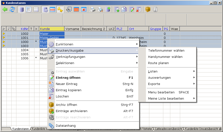 Zum AusdruckenDatenausgabe auf Papier oder in eine Datei klicken Sie mit der rechten Maustaste (oder drücken Sie [F4]) in einer Auswahlliste (in unserem Beispiel der Kundenstamm). Es erscheint das KontextmenüEin Rechtsklick zeigt zum Umfeld passende Funktionen.. Klicken Sie auf „Drucken / Ausgabe“ und wählen Sie den gewünschten Ausdruck.