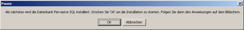 Im Laufe der Installation werden Sie aufgefordert, die Installation der Datenbank Pervasive SQL zu bestätigen. Drücken Sie auf OK, um die Installation fortzusetzen.