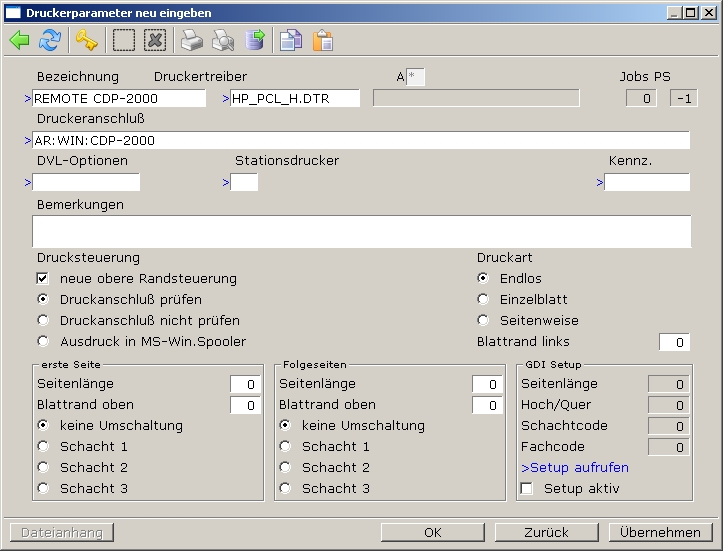 Unter Druckeranschluß tragen Sie "AR:" für Autoremote, "WIN:" für Windowsdrucker und statt "CDP-2000" ihren Druckernamen hintereinander ein, so wie es im Bild dargestellt ist.
