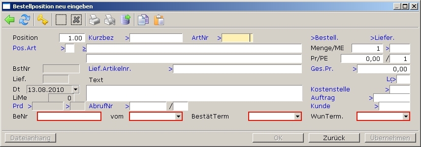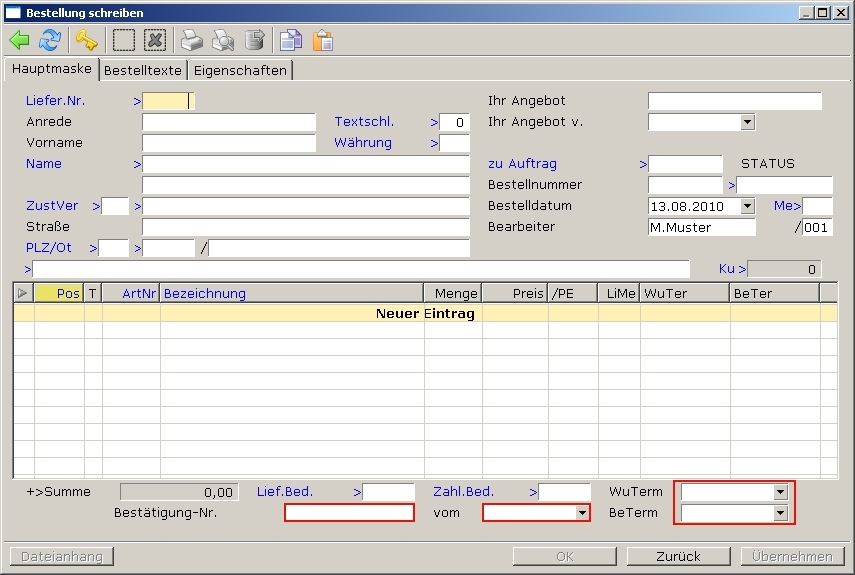 Die Bestellmaske und die Bestellpositionen sind jeweils um Felder zur Aufnahme der Termine erweitert: