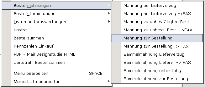 Unter „alle Einträge“ finden Sie die Menüpunkte um Mahnungen zu überfälligen Bestellungen zu drucken. Die Ausgabe kann auch als Fax oder Email erfolgen.