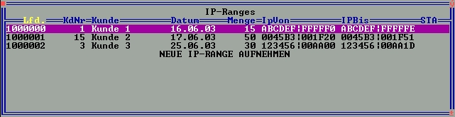 Der Menüpunkt zum Aufrufen der Range-Verwaltung befindet sich im Menü Prod/Betrieb. Es öffnet sich eine Liste der bisher vergebenen Kunden-Gesamtbereiche