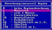 Wählen Sie das rechte Feld Abrech im Abschnitt Vertragsdaten . Drücken Sie die Taste F1. Es öffnet sich die Auswahlliste Abrechnungsintervalle der Kopien. Wie bei den Gebühren wählen Sie auch hier den gewünschten Abrechnungsmodus aus und übernehmen ihn mit der Taste Eingabe in das Feld Abrech. Wählen Sie nur eine Zahl erfolgt die Abrechnung in monatlichen Intervallen, bezogen auf den Vertragsbeginn (Laufzeit von), jeweils zum Ende des Monats. Tragen Sie zusätzlich ein Q ein, erfolgt die Abrechnung zum jeweiligen Quartalsende, unabhängig vom Vertragsbeginn. Kopienabrechnungen können nur im Rückwirkend erhoben werden.