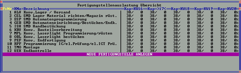 - Ausweisung der Auslastung der Fertigungsstellen Wochenweise in Prozent, Stunden und Personen.