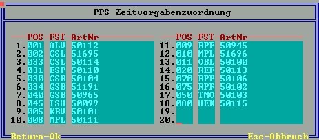Die Zeittabelle ist hier nach Kennziffer sortiert aufgelistet. Im Artikelstamm kann im Feld "PPS Bauteil-Zeitvorgabe" ein Eintrag über die Kennziffer zugeordnet werden. Das Feld ist in der Artikelmaske unter ">EinkPara" mit der Taste F1 erreichbar.