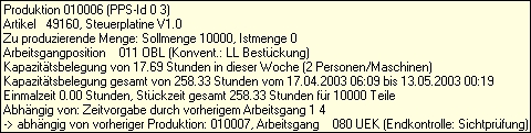 Dort wird in der letzten Zeile die Planungsabhängigkeit dieses Arbeitsgangs angezeigt. Die Angabe "Zeitvorgabe durch vorherigen Arbeitsgang 1 4" bezieht sich auf die PPS-Id eines Arbeitsgangs während der Planung. Dabei bezieht sich die erste Ziffer 1 auf die nächste Produktion, eine Ebene tiefer und die Ziffer 4 auf den 4. Arbeitsgang in der Produktion 1. Die PPS-Id des abgerufenen Arbeitsgangs steht in der ersten Zeile, hier PPS-Id 0 3 (0 - Endprodukt der Hierarchie, 3. Arbeitsgang). Bei hierarchischen Produktionen werden die Produktionen vom Endprodukt abwärts in der Hierarchie durchnummeriert. Das Endprodukt beginnt mit der Ziffer 0.